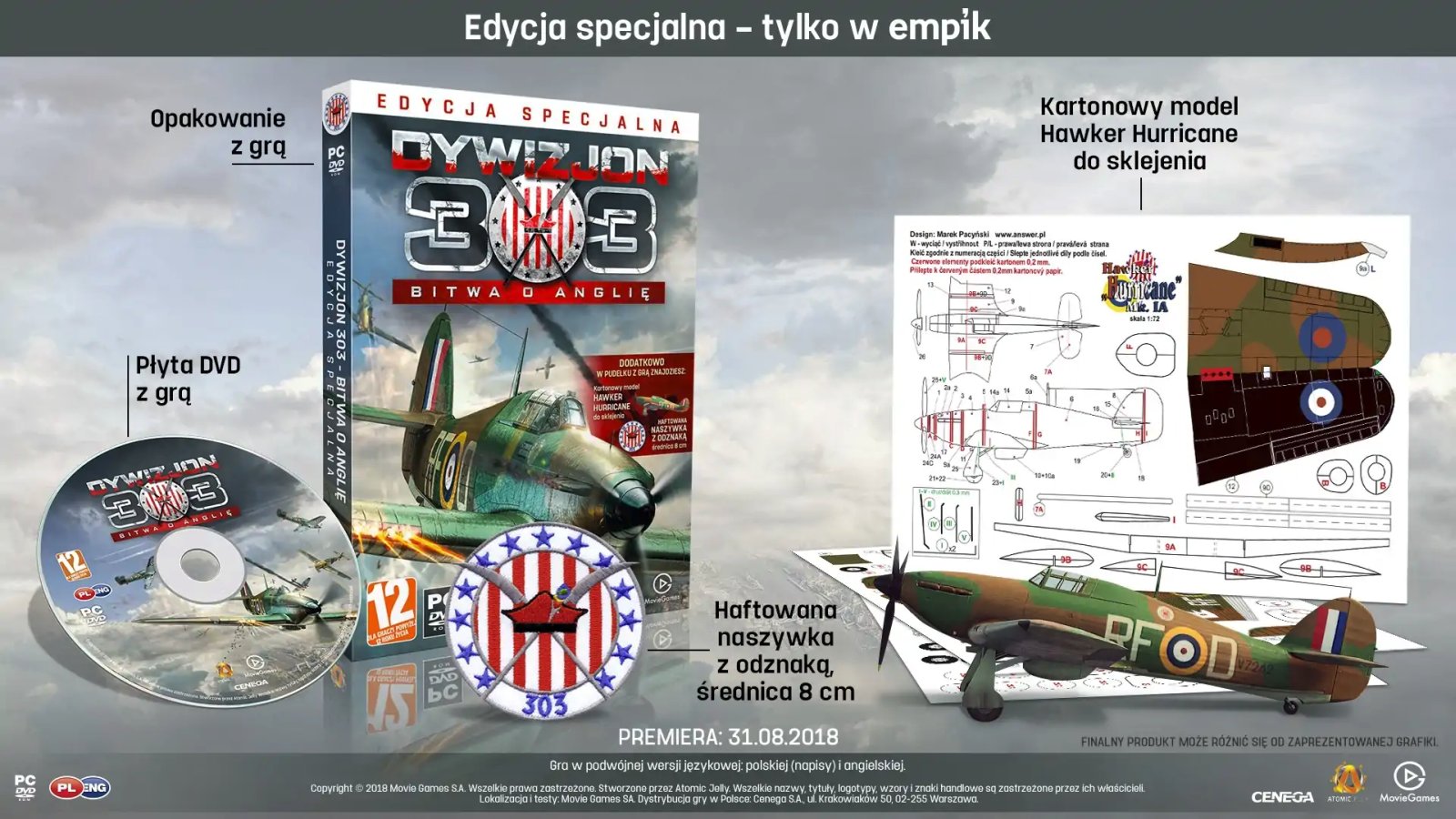 Dywizjon 303: Bitwa o Anglię w polskiej wersji językowej będzie dostępny od 31 sierpnia na komputery osobiste. W dniu premiery gra ukaże się z dwóch edycjach – podstawowej, zawierającej kartonowy model samolotu Hawker Hurricane oraz specjalnej (dostępnej w sieci Empik), wzbogaconej dodatkowo o naszywkę z odznaką Dywizjonu 303 (średnica – 8 cm).