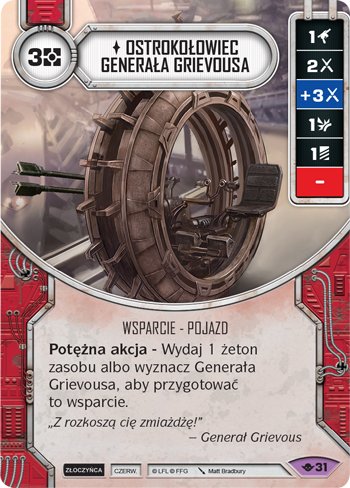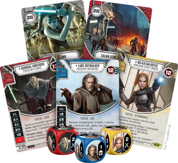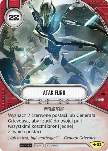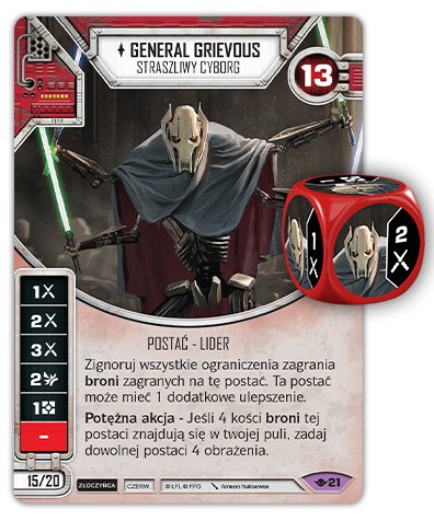 Wyposażenie Generała Grievousa w cztery bronie robi z niego prawdziwą maszynę do zabijania, a jeśli graczowi uda się umieścić wszystkie kości broni w puli, może zadać w ramach potężnej akcji aż cztery obrażenia jednej z wrogich postaci. Jak łatwo zauważyć, w przypadku talii z generałem strategia gry jest jasna od samego początku – aby wykorzystać jego pełny potencjał, gracz musi zainwestować mnóstwo środków i czasu w uzbrojenie go. Nagroda jest jednak tego warta – Generał Grievous jest zdecydowanie jedną z najgroźniejszych postaci w całej grze.