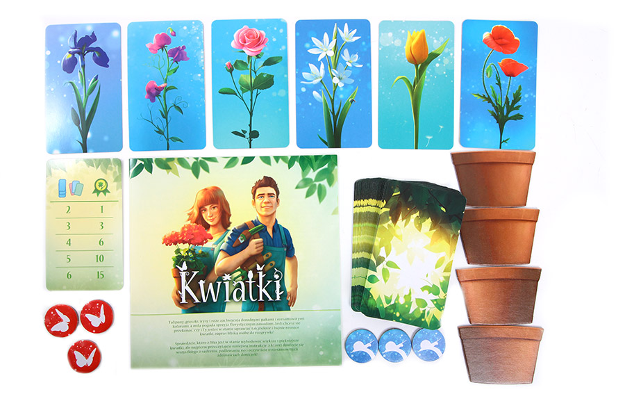 Jedna z najnowszych propozycji wydawnictwa Rebel to Kwiatki - gra dla par, której uczestnicy starają się ułożyć jak najpiękniejszy bukiet kwiatów. Cel rozgrywki jest prosty - korzystając z dostępnych akcji należy sadzić i pielęgnować kwiaty w doniczkach, dbając by urosły jak największe. W odpowiednim momencie trzeba je ściąć i dodać do własnych zbiorów, gromadząc tym samym punkty i torując sobie drogę do zwycięstwa. Szerzej o zasadach gry traktuje filmik instruktażowy.